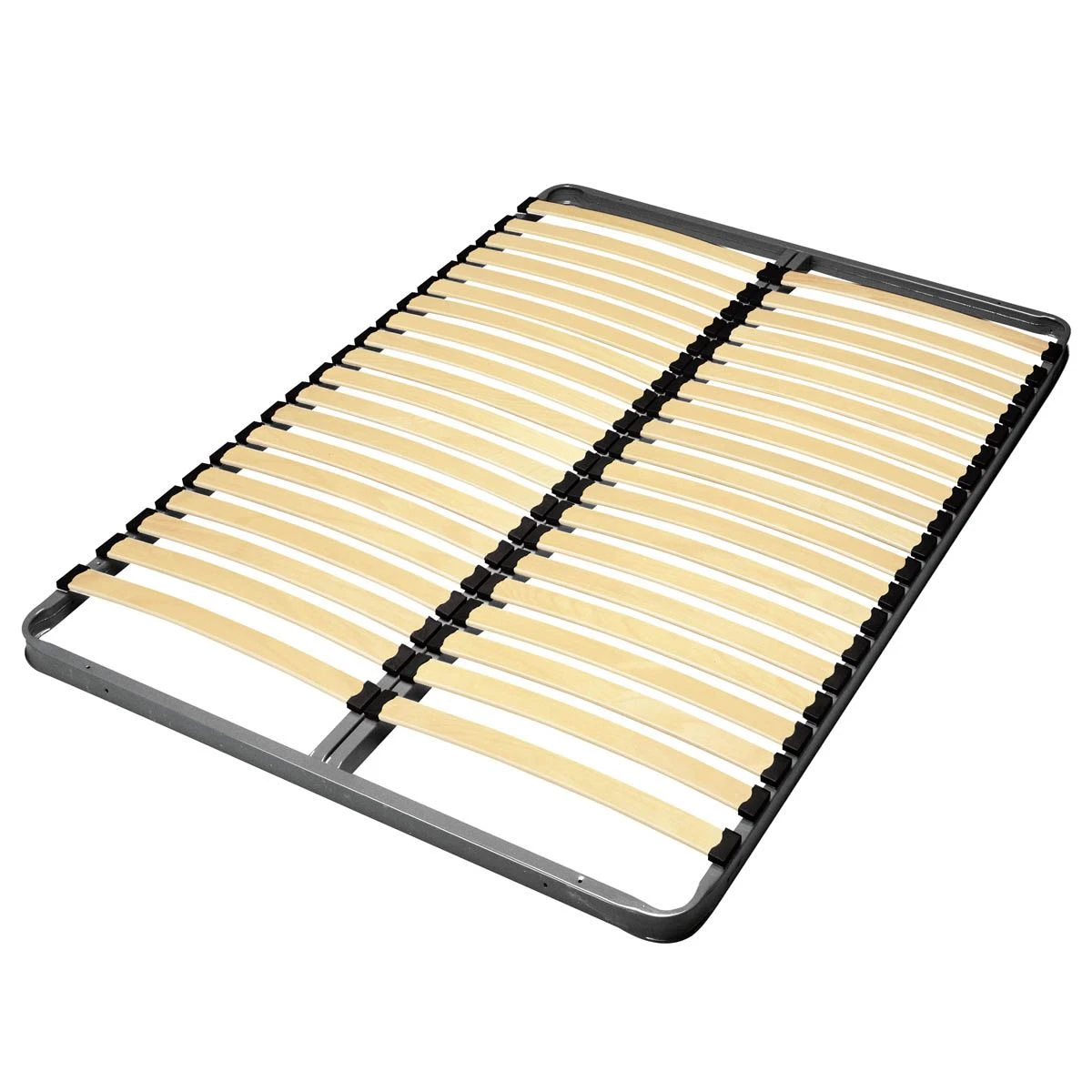Cadre métal cintré en tube rectangulaire de 40 x 27 mm / Coins arrondis / Double axe central de renfort pour les doubles couchages afin de privilégier le confort individuel / Embouts polyéthylène clipsés / Peinture époxy gris, la garantie quasi absolue contre la corrosion / Suspension : 20 lattes multiplis bois, largeur 50 mm, épaisseur 8 mm |