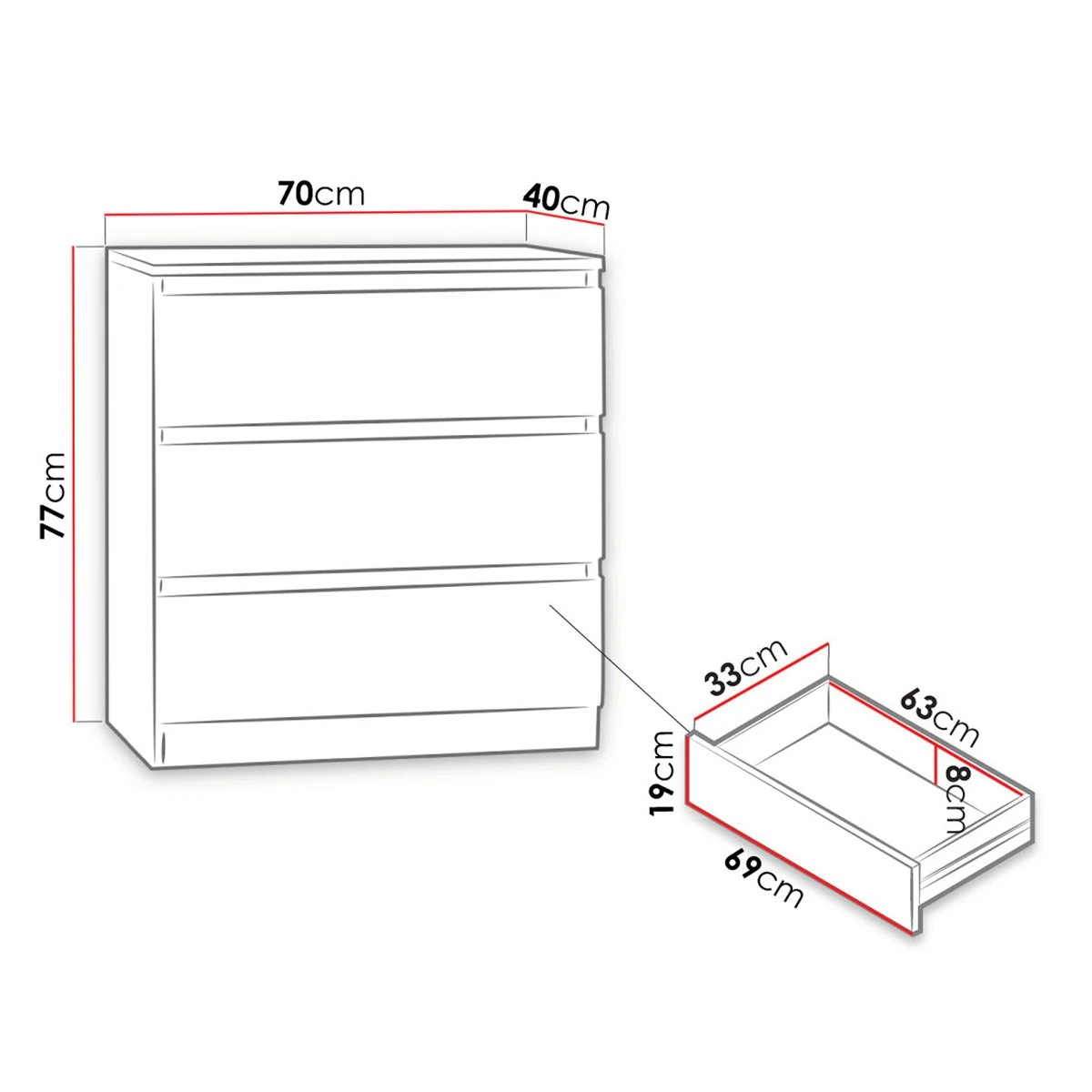 L. 40 x l. 70 x H. 77 cm |