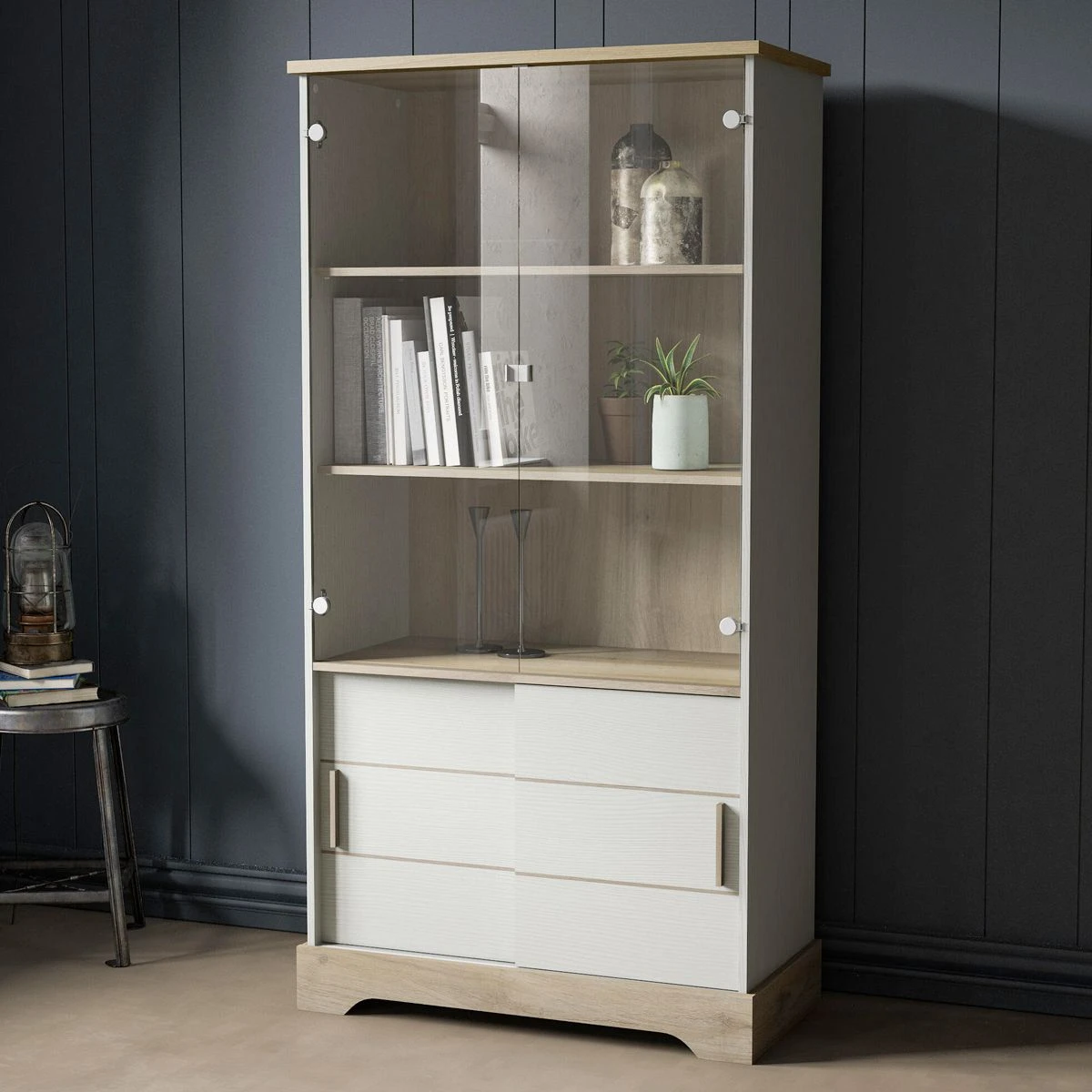 Dessus débordant, effet casquette finition chant épais / Partie vitrée, dim. utiles : 85 x 40 x 110 cm / Partie portes coulissantes, dim. utiles : 85 x 40 x 54cm / 3 rayons réglables sur 3 niveaux / 2 jeux de fines baguettes autocollantes positionnables sur les façades de portes / Poignées barrette en plastique coloris chêne Kronberg |
