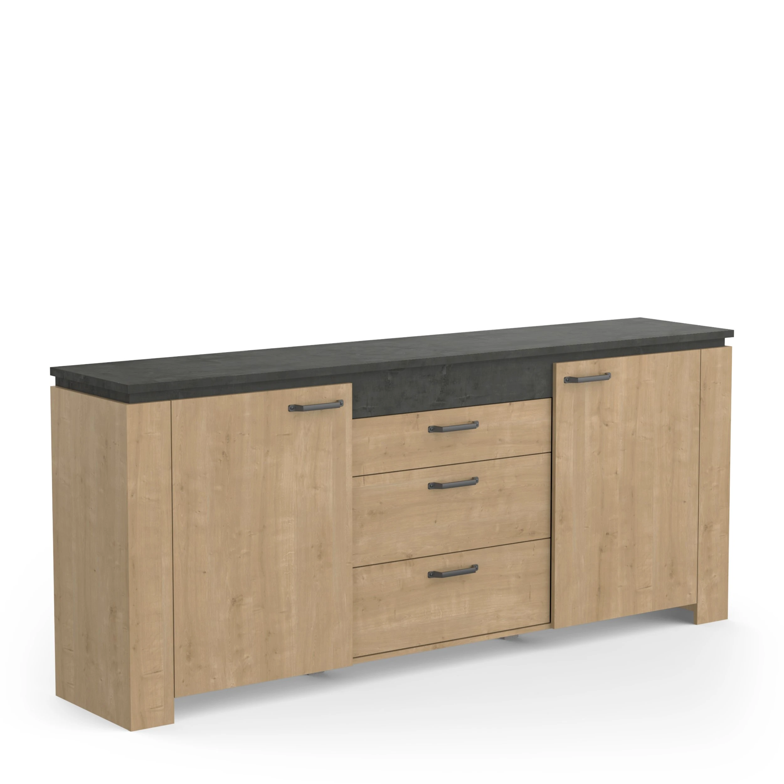 AUSTIN enfilade 2 portes 3 tiroirs en panneaux de particules de 15 mm, de coloris chêne hamilton. De dimensions L 203,80 x P 42 x H 87,80 cm, dessus en 100% mélamine de 22 mm, résistant à l’humidité coloris sidewalk (charge maxi 36 kg)