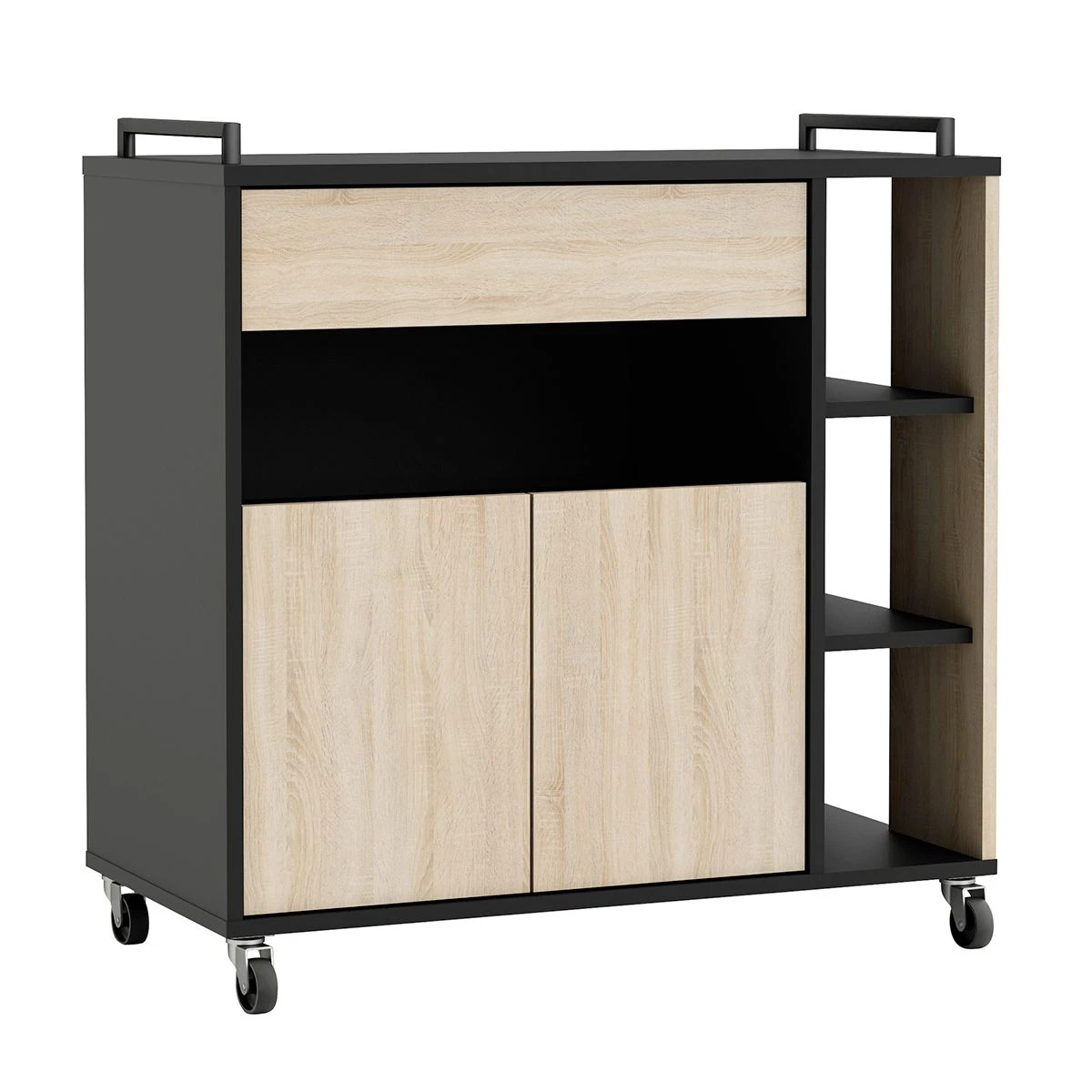 1 tiroir monté sur coulisses métal, dimensions utiles: 53 x 7 x 31 cm / 1 niche, dimensions utiles: 56 x 19 x 37 cm / 2 portes, volume utile: 56 x 32 x 37 cm / 3 niches, 2 rayons, dimensions utiles: 16 x 21 x 40 cm / 2 poignées plastique anti – chute |