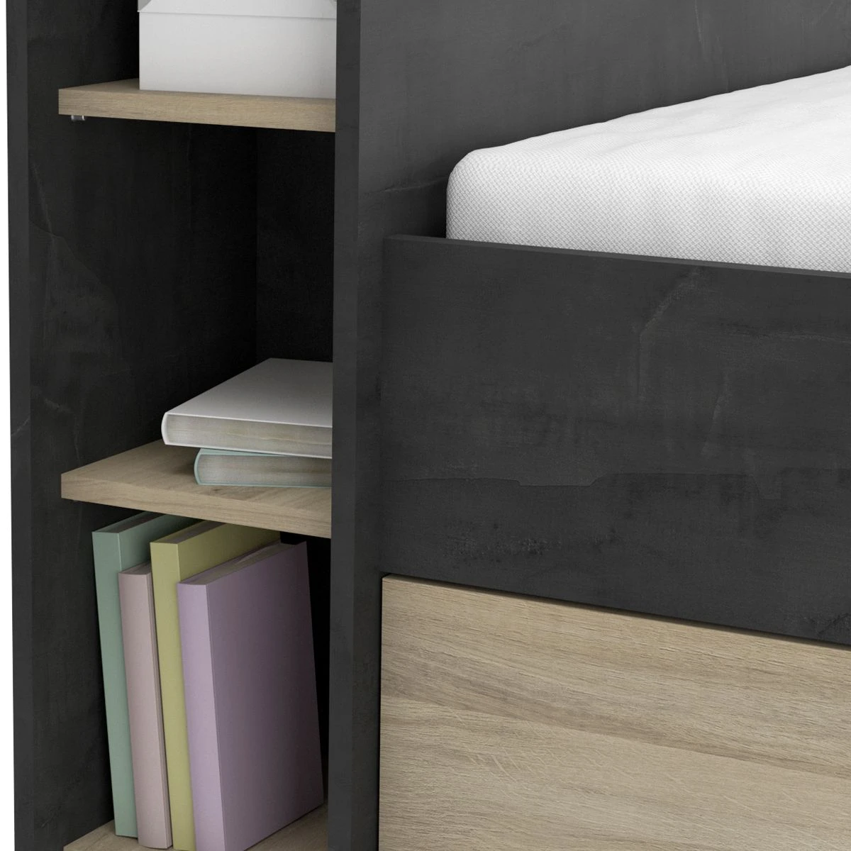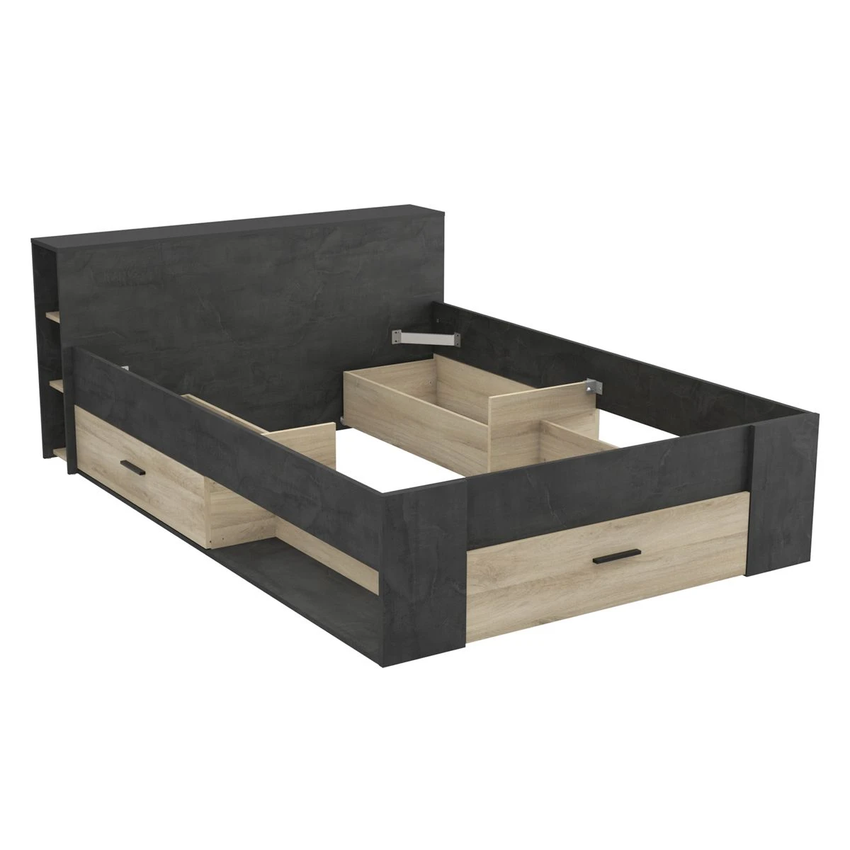 Pour couchage 140 x 190 cm / Pans : les 2 pieds de lits et 2 façades de tiroirs latéraux en 18 mm / Hauteur tête de lit : 76 cm / Epaisseur tête de lit : 23,9 cm / Niches, dim. utiles : L 95 x P 23 x H 23 cm / Tiroirs, dim. utiles : L 90 x P 38 x H 18 cm / Coulisses à galets / 3 rayons / rangements utiles dans la tête de lit : 24 et 21 cm / 3 poignées barrettes 150 mm extraxe 128 mm grises sidewalk / Goujons en 24 mm |