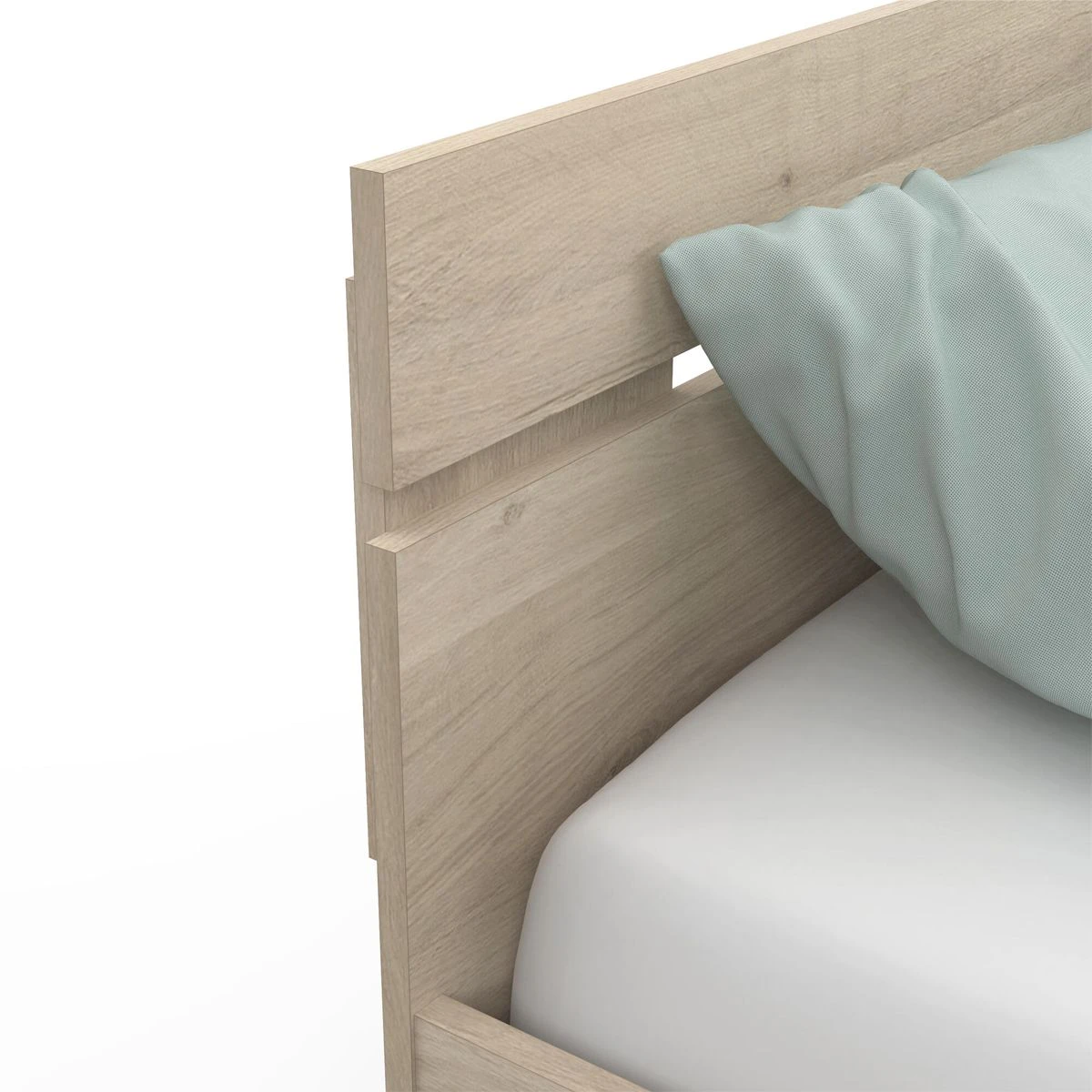 Panneaux de particules 15mm et pans 18mm. Montage des tiroirs à droite ou à gauche du lit. 2 tiroirs montés sur coulisses à billes 17mm (dimensions utiles : 56 x 34 x 11cm). 1 grande niche (dimensions utiles : 69 x 26 x 36cm). Poignée barrette 150 x 24 x 12mm laqué gris.