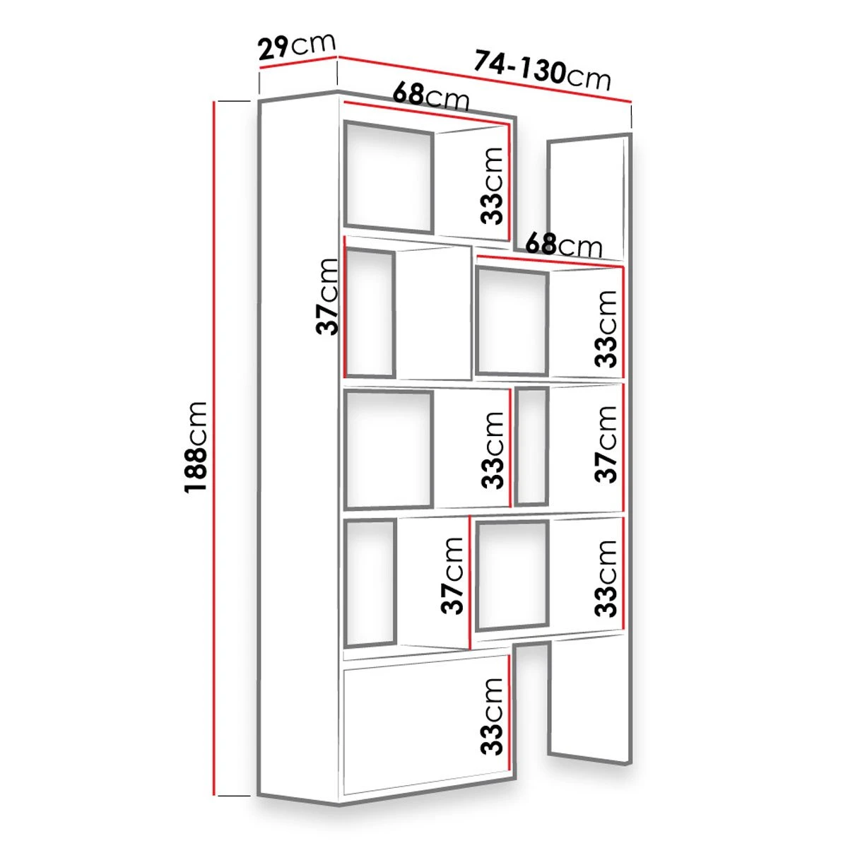L. 74/130 x l. 29 x H. 188 cm |