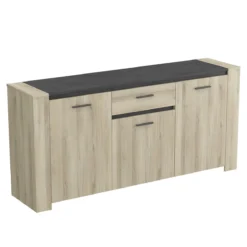 Panneaux de particules, épaisseur 18 mm : dessus – épaisseur 15 mm : côtés / fronton / tiroir / montant / fond / séparations / rayon / portes