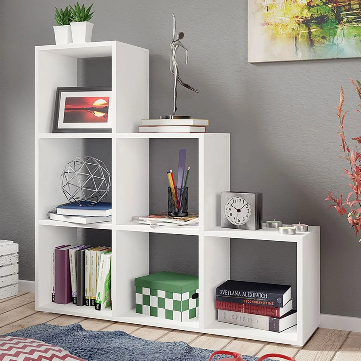 Grâce Ă cette structure, la bibliothèque a l’air moderne et rĂ©pond aux aspects fonctionnels. Vous pouvez y stocker Ă la fois des livres scolaires, des photos et d’autres objets prĂ©fĂ©rĂ©s. De plus, la bibliothèque sera parfaite pour les intĂ©rieurs inclinĂ©s ou comme cloison optique d’une chambre pour frères et soeurs, ou comme zone d’Ă©tude sĂ©parĂ©e.